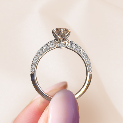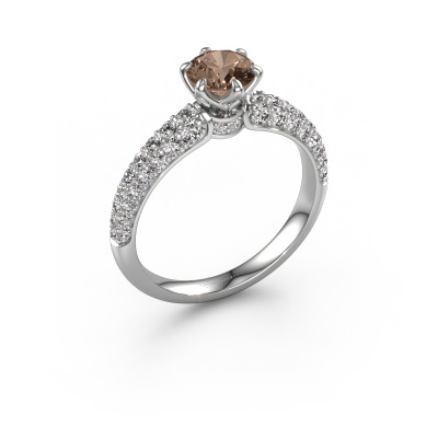 The ring shown above is called the Meryl. We call this type of ring a pavé solitaire ring because it has one centre gemstone and a band that is also pave set with gemstones. This engagement ring is made in 14 Carat white gold set with a 0.70 crt round brown diamond, and pave set diamonds at the sides. Each piece of jewellery is made just for you, with attention to detail and design.This exclusive white gold pavé solitaire engagement ring has an exquisite round brown diamond centre stone. To further accentuate the centre stone, the band is set full with more diamonds. Its open prong setting allows light to strike the brown diamond from various angles and this adds sparkle to your brown diamond ring. The photo shown above depicts the goldsmith's carefully handcrafted details of the ring. The high positioning of the centre stone is truly eye-catching. The perfect engagement ring for the crown jewel of your life!After receiving your order, our goldsmiths will passionately start the creative process of making your engagement ring in our own studio. Because we don't have a big stockpile, these costs will not be passed on to you. Our pricing is proof of that! We offer top quality jewels at lowest price, guaranteed.Have you found a specific engagement ring somewhere which you would like to give to your loved one? Please feel free to express your wishes to our jewel designers because we would be honoured to turn your design into a exclusive engagement ring. You can follow the development of your ring design because we use 3D drawings. This gives you a realistic preview of how your design will look. You can also preorder a dummy. A dummy is a plastic ring, which can be shaped according your ring design. You can try it on and check if its width and size are suitable for you. We will gladly send you a non-binding offer, based on a fair price/ quality ratio. It will amaze you, considering the quality of the ring and gemstones.To make it easier for you, we offer a 30 day return policy. Check our terms and conditions.