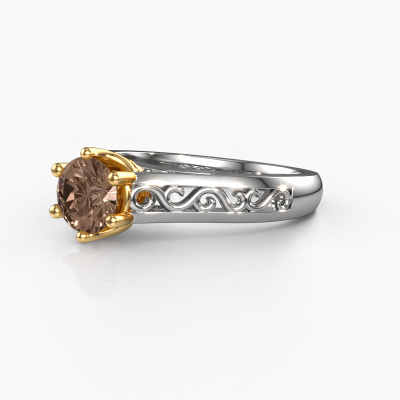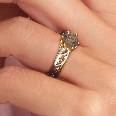The ring shown above is called the Shan, we call this a solitaire ring because it contains a single gemstone. The engagement ring is made in 14 Carat white gold and has a round brown diamond of 0.80 crt. The cool thing about our configurator is that you can compile your own piece of jewellery, into a completely personalized one. This solitaire ring is crafted in the precious metals white gold with gold, but of course you are free to pick your own colours. Each piece of jewellery is made by a team of passionate goldsmiths and jewel designers. This will make your crown jewel truly eye-catching.The solitaire ring is a special type of engagement ring. Its open prong setting allows light to strike the gemstone from various angles. This Celtic engagement ring is a stunning eye-catcher because of the high positioning of the gemstone. In order for you to commemorate your proposal with a unique ring, we carefully adorn this solitaire ring by hand. The love of your life deserves nothing but the best. By using our modern techniques, we can design and customize the finest quality jewels with the utmost care for you. Our engagement rings are always priced 30 percent lower than other jewellers. We make engagement rings to order so we don't have to maintain a large stock. If you have a certain budget, we are more than happy to advice you accordingly.Have you found a specific engagement ring somewhere which you would like to give to your loved one? Please feel free to express your wishes to our jewel designers because we would be honoured to turn your design into a Celtic engagement ring. You can follow the development of your ring design because we use 3D drawings. This gives you a realistic preview of how your design will look. You can also preorder a dummy. A dummy is a plastic ring, which can be shaped according your ring design. You can try it on and check if its width and size are suitable for you. We will gladly send you a non-binding offer, based on a fair price/ quality ratio. It will amaze you, considering the quality of the ring and gemstones.To make it easier for you, we offer a 30 day return policy. Check our terms and conditions.
