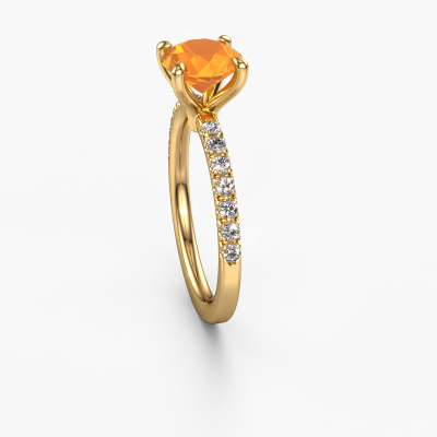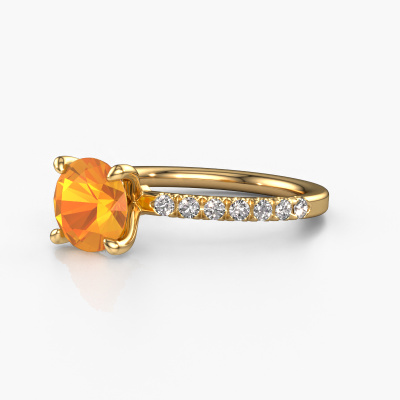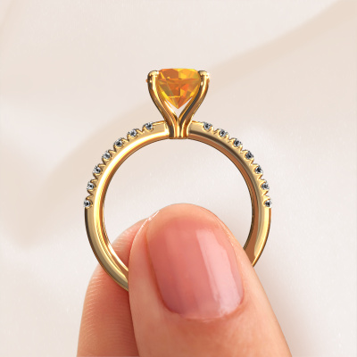 The ring shown above is called the Crystal RND 2. We call this type of ring a pavé solitaire ring because it has one centre gemstone and a band that is also pave set with gemstones. The 14 Carat gold engagement ring is set with a round 7.3 mm citrin centre stone and the band is pave set with lab grown diamond gemstones. Each jewel is unique in every way! Simply customize to your liking,This classic gold pavé solitaire engagement ring has an exquisite round citrin centre stone. To further accentuate the centre stone, the band is fully set with more lab-grown diamonds. Its open prong setting allows light to strike the citrin from various angles and this adds sparkle to your citrin ring. The photo shown above depicts the goldsmith's carefully handcrafted details of the ring. The high positioning of the centre stone is truly eye-catching. The perfect engagement ring for the crown jewel of your life! After receiving your order, our goldsmiths will start the creative process of making your Crystal RND 2 engagement ring. We don't keep stock. This is advantageous because these costs will not be passed on to you. Therefore, we can offer jewellery at exceptionally low prices.Different styles of new rings are made daily by our team. Perhaps you have found a pavé solitaire engagement ring somewhere. One you would like to give to your loved one. Please feel free to share your thoughts and design with our jewel designers. We would love to turn your design into a classic engagement ring. You can follow the development of your ring design because we use very detailed 3D drawings. On top of that, you can order a dummy of the design. A dummy is a plastic ring, which can be shaped according your ring design. You can try it on and check if the engagement ring is up to standard. We will gladly send you a non-binding offer, based on a fair price/ quality ratio. The offer will baffle you, considering the quality of the ring and gemstones.To make it easier for you, we offer a 30 day return policy. Check our terms and conditions.