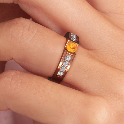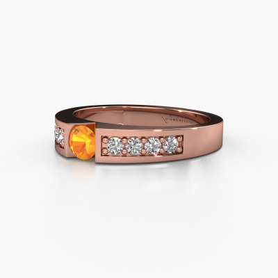 The ring shown above is called the Lizzy 2. We call this type of ring a pavé solitaire ring because it has one centre gemstone and a band that is also pave set with gemstones. This engagement ring is made in 14 Carat rose gold set with a 4.2 mm round citrin, and pave set diamonds at the sides. Each piece of jewellery is made to shine bright around your finger. Each jewel is hand made with love by our goldsmiths.This modern rose gold pavé solitaire engagement ring has an exquisite round citrin centre stone. To further accentuate the centre stone, the band is set full with more diamonds. Its open prong setting allows light to strike the citrin from various angles and this adds sparkle to your citrin ring. The photo shown above depicts the goldsmith's carefully handcrafted details of the ring. The high positioning of the centre stone is truly eye-catching. The perfect engagement ring for the crown jewel of your life!By using a combination of the latest modern techniques, combined with ancient crafting, we can make all our engagement rings in our own studio. Each jewel is made to order. This is advantageous because we can offer you a price you won't find anywhere else.Our team adds new designs to our online collection daily. Our designers and goldsmiths work together in creating the best design. We strive to offer a diverse collection of jewels. Perhaps you have a specific jewel design in mind. One you came across somewhere. Please contact us for a free consultation. We will make you an offer, based on a fair price/ quality ratio, that will baffle you.To make it easier for you, we offer a 30 day return policy. Check our terms and conditions.