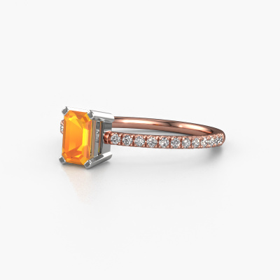 The ring shown above is called the Denita 2 EME. We call this type of ring a pavé solitaire ring because it has one centre gemstone and a band that is also pave set with gemstones. This engagement ring is made in 14 Carat rose gold set with a 6x4 mm emerald cut citrin, and pave set diamonds at the sides. Each piece of jewellery is made just for you by our master goldsmiths in our own studio.This traditional rose gold pavé solitaire engagement ring has an exquisite emerald cut citrin centre stone. To further accentuate the centre stone, the band is set full with more diamonds. Its open prong setting allows light to strike the citrin from various angles and this adds sparkle to your citrin ring. The photo shown above depicts the goldsmith's carefully handcrafted details of the ring. The high positioning of the centre stone is truly eye-catching. The perfect engagement ring for the crown jewel of your life!Are you on a budget? Please feel free to contact us, so we can go discuss your options. We offer our engagement rings at guaranteed best price, because we make them to order. You won't find such a price anywhere else!Our team adds new designs to our online collection daily. Our designers and goldsmiths work together in creating the best design. We strive to offer a diverse collection of jewels. Perhaps you have a specific jewel design in mind. One you came across somewhere. Please contact us for a free consultation. We will make you an offer, based on a fair price/ quality ratio, that will baffle you.To make it easier for you, we offer a 30 day return policy. Check our terms and conditions.