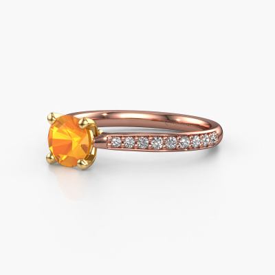 The ring shown above is called the Mignon rnd 2. We call this type of ring a pavé solitaire ring because it has one centre gemstone and a band that is also pave set with gemstones. The 14 Carat rose gold engagement ring is set with a round 6 mm citrin centre stone and the band is pave set with lab grown diamond gemstones. Each jewel is made by a team of passionate goldsmiths and jewel designers. This will make your crown jewel truly eye-catching.This luxury rose gold pavé solitaire engagement ring has an exquisite round citrin centre stone. To further accentuate the centre stone, the band is fully set with more lab-grown diamonds. Its open prong setting allows light to strike the citrin from various angles and this adds sparkle to your citrin ring. The photo shown above depicts the goldsmith's carefully handcrafted details of the ring. The high positioning of the centre stone is truly eye-catching. The perfect engagement ring for the crown jewel of your life! By using our modern techniques, we can design and customize the finest quality jewels with the utmost care for you. Our engagement rings are always priced 30 percent lower than other jewellers. We make engagement rings to order so we don't have to maintain a large stock. If you have a certain budget, we are more than happy to advice you accordingly.Different styles of new rings are made daily by our team. Perhaps you have found a pavé solitaire engagement ring somewhere. One you would like to give to your loved one. Please feel free to share your thoughts and design with our jewel designers. We would love to turn your design into a luxury engagement ring. You can follow the development of your ring design because we use very detailed 3D drawings. On top of that, you can order a dummy of the design. A dummy is a plastic ring, which can be shaped according your ring design. You can try it on and check if the engagement ring is up to standard. We will gladly send you a non-binding offer, based on a fair price/ quality ratio. The offer will baffle you, considering the quality of the ring and gemstones.To make it easier for you, we offer a 30 day return policy. Check our terms and conditions.