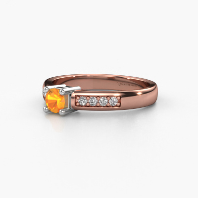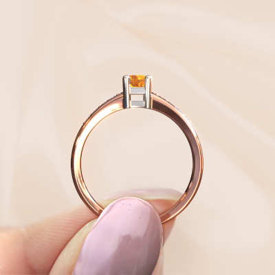 The ring shown above is called the Eline 2. We call this type of ring a pavé solitaire ring because it has one centre gemstone and a band that is also pave set with gemstones. The 14 Carat rose gold engagement ring is set with a round 3.7 mm citrin centre stone and the band is pave set with diamond gemstones. Each jewel is unique in every way! Simply customize to your liking,This modern rose gold pavé solitaire engagement ring has an exquisite round citrin centre stone. To further accentuate the centre stone, the band is fully set with more diamonds. Its open prong setting allows light to strike the citrin from various angles and this adds sparkle to your citrin ring. The photo shown above depicts the goldsmith's carefully handcrafted details of the ring. The high positioning of the centre stone is truly eye-catching. The perfect engagement ring for the crown jewel of your life! Because we design and deliver our own rings, we can offer you a engagement ring at a price you won't find anywhere else. A ring is made to order, which helps prevent excess supplies, so we can make you a great price offer. We understand it feels risky, buying your engagement ring online, but we will gladly assist in the designing process, taking your budget into consideration.Our team adds new designs to our online collection daily. Our designers and goldsmiths work together in creating the best design. We strive to offer a diverse collection of jewels. Perhaps you have a specific jewel design in mind. One you came across somewhere. Please contact us for a free consultation. We will make you an offer, based on a fair price/ quality ratio, that will baffle you.To make it easier for you, we offer a 30 day return policy. Check our terms and conditions.