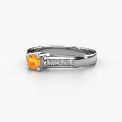 The ring shown above is called the Eline 2. We call this type of ring a pavé solitaire ring because it has one centre gemstone and a band that is also pave set with gemstones. The 14 Carat white gold engagement ring is set with a round 3.7 mm citrin centre stone and the band is pave set with diamond gemstones. Each jewel is unique in every way! Simply customize to your liking,This modern white gold pavé solitaire engagement ring has an exquisite round citrin centre stone. To further accentuate the centre stone, the band is fully set with more diamonds. Its open prong setting allows light to strike the citrin from various angles and this adds sparkle to your citrin ring. The photo shown above depicts the goldsmith's carefully handcrafted details of the ring. The high positioning of the centre stone is truly eye-catching. The perfect engagement ring for the crown jewel of your life! Because we design and deliver our own rings, we can offer you a engagement ring at a price you won't find anywhere else. A ring is made to order, which helps prevent excess supplies, so we can make you a great price offer. We understand it feels risky, buying your engagement ring online, but we will gladly assist in the designing process, taking your budget into consideration.Our team adds new designs to our online collection daily. Our designers and goldsmiths work together in creating the best design. We strive to offer a diverse collection of jewels. Perhaps you have a specific jewel design in mind. One you came across somewhere. Please contact us for a free consultation. We will make you an offer, based on a fair price/ quality ratio, that will baffle you.To make it easier for you, we offer a 30 day return policy. Check our terms and conditions.