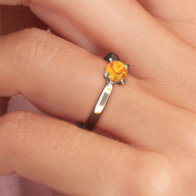 The ring shown above is called the Mignon rnd 1, we call this a solitaire ring because it contains a single gemstone. The engagement ring is made in platinum and has a round citrin of 5 mm. The cool thing about our configurator is that you can compile your own piece of jewellery, into a completely personalized one. This solitaire ring is crafted in the precious metals platinum with platinum, but of course you are free to pick your own colours. Each piece of jewellery is made with passion and love by one of our master goldsmiths.The solitaire ring is a special type of engagement ring. Its open prong setting allows light to strike the gemstone from various angles. This classic engagement ring is a stunning eye-catcher because of the high positioning of the gemstone. In order for you to commemorate your proposal with a unique ring, we carefully adorn this solitaire ring by hand. The love of your life deserves nothing but the best. After receiving your order, our goldsmiths will passionately start the creative process of making your engagement ring in our own studio. Because we don't have a big stockpile, these costs will not be passed on to you. Our pricing is proof of that! We offer top quality jewels at lowest price, guaranteed.Have you found a specific engagement ring somewhere which you would like to give to your loved one? Please feel free to express your wishes to our jewel designers because we would be honoured to turn your design into a classic engagement ring. You can follow the development of your ring design because we use 3D drawings. This gives you a realistic preview of how your design will look. You can also preorder a dummy. A dummy is a plastic ring, which can be shaped according your ring design. You can try it on and check if its width and size are suitable for you. We will gladly send you a non-binding offer, based on a fair price/ quality ratio. It will amaze you, considering the quality of the ring and gemstones.To make it easier for you, we offer a 30 day return policy. Check our terms and conditions.