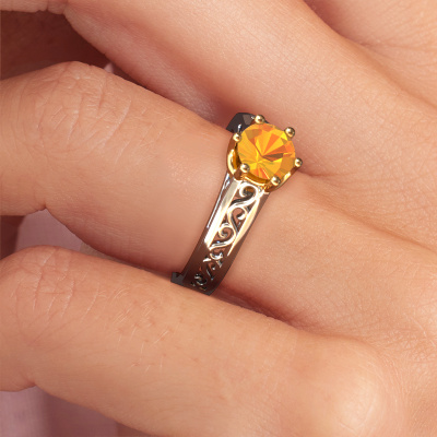 The ring shown above is called the Shan, we call this a solitaire ring because it contains a single gemstone. The engagement ring is made in 14 Carat white gold and has a round citrin of 6 mm. The cool thing about our configurator is that you can compile your own piece of jewellery, into a completely personalized one. This solitaire ring is crafted in the precious metals white gold with gold, but of course you are free to pick your own colours. Each piece of jewellery is made by a team of passionate goldsmiths and jewel designers. This will make your crown jewel truly eye-catching.The solitaire ring is a special type of engagement ring. Its open prong setting allows light to strike the gemstone from various angles. This Celtic engagement ring is a stunning eye-catcher because of the high positioning of the gemstone. In order for you to commemorate your proposal with a unique ring, we carefully adorn this solitaire ring by hand. The love of your life deserves nothing but the best. By using our modern techniques, we can design and customize the finest quality jewels with the utmost care for you. Our engagement rings are always priced 30 percent lower than other jewellers. We make engagement rings to order so we don't have to maintain a large stock. If you have a certain budget, we are more than happy to advice you accordingly.Have you found a specific engagement ring somewhere which you would like to give to your loved one? Please feel free to express your wishes to our jewel designers because we would be honoured to turn your design into a Celtic engagement ring. You can follow the development of your ring design because we use 3D drawings. This gives you a realistic preview of how your design will look. You can also preorder a dummy. A dummy is a plastic ring, which can be shaped according your ring design. You can try it on and check if its width and size are suitable for you. We will gladly send you a non-binding offer, based on a fair price/ quality ratio. It will amaze you, considering the quality of the ring and gemstones.To make it easier for you, we offer a 30 day return policy. Check our terms and conditions.