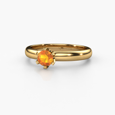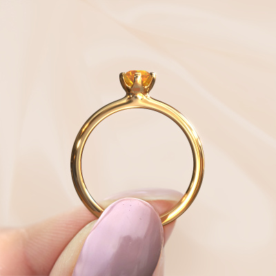 In your eyes, no one else compares to her. She is one in a million, unlike anyone else and pure? These qualities are emphasized perfectly by our modern gold solitaire citrin ring. This citrin is carefully selected by our keen artisan goldsmiths. It equals the unique qualities of the love of your life. There is no better way to memorialize your proposal than this symbol of true love. The ring shown above is called the Lorretta, we call this a solitaire ring because it contains a single gemstone. The engagement ring is made in 14 Carat gold and has a round citrin of 4.7 mm. Each piece of jewellery is made with passion and love by one of our master goldsmiths.By using a combination of the latest modern techniques, combined with ancient crafting, we can make all our engagement rings in our own studio. Each jewel is made to order. This is advantageous because we can offer you a price you won't find anywhere else.Our team adds new designs to our online collection daily. Our designers and goldsmiths work together in creating the best design. We strive to offer a diverse collection of jewels. Perhaps you have a specific jewel design in mind. One you came across somewhere. Please contact us for a free consultation. We will make you an offer, based on a fair price/ quality ratio, that will baffle you.To make it easier for you, we offer a 30 day return policy. Check our terms and conditions.