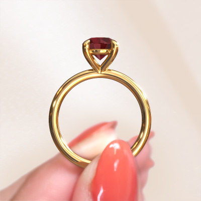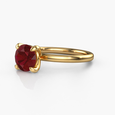 The ring shown above is called the Simone RND 1. We call this a solitaire ring because it contains a single gemstone. The engagement ring is made in 14 Carat gold and has a round ruby of 7.3 mm. This extraordinary classic gold solitaire engagement ring is set with a beautiful round ruby to add sparkle to your proposal. The open prong setting allows light to strike the gemstone from various angles. Did you know a diamond represents everlasting love and fidelity? This makes it a perfect centrepiece. Our goldsmith carefully positions the gemstone of your choosing high on top of the ring, which makes it stand out. Each piece of jewellery is made just for you, with attention to detail and design.By using a combination of the latest modern techniques, combined with ancient crafting, we can make all our engagement rings in our own studio. Each jewel is made to order. This is advantageous because we can offer you a price you won't find anywhere else.Different styles of new rings are made daily by our team. Perhaps you have found a solitaire engagement ring somewhere. One you would like to give to your loved one. Please feel free to share your thoughts and design with our jewel designers. We would love to turn your design into a classic engagement ring. You can follow the development of your ring design because we use very detailed 3D drawings. On top of that, you can order a dummy of the design. A dummy is a plastic ring, which can be shaped according your ring design. You can try it on and check if the engagement ring is up to standard. We will gladly send you a non-binding offer, based on a fair price/ quality ratio. The offer will baffle you, considering the quality of the ring and gemstones.To make it easier for you, we offer a 30 day return policy. Check our terms and conditions.