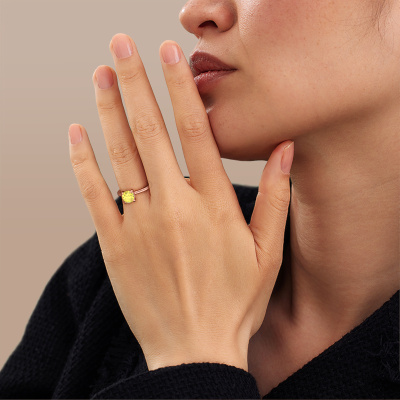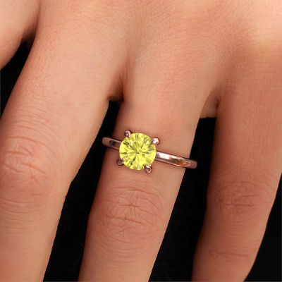 The ring shown above is called the Simone RND 1. We call this a solitaire ring because it contains a single gemstone. The engagement ring is made in 14 Carat rose gold and has a round yellow lab grown diamond of 7.3 mm. This extraordinary classic rose gold solitaire engagement ring is set with a beautiful round yellow lab grown diamond to add sparkle to your proposal. The open prong setting allows light to strike the gemstone from various angles. Did you know a diamond represents everlasting love and fidelity? This makes it a perfect centrepiece. Our goldsmith carefully positions the gemstone of your choosing high on top of the ring, which makes it stand out. Each piece of jewellery is made just for you, with attention to detail and design.By using a combination of the latest modern techniques, combined with ancient crafting, we can make all our engagement rings in our own studio. Each jewel is made to order. This is advantageous because we can offer you a price you won't find anywhere else.Different styles of new rings are made daily by our team. Perhaps you have found a solitaire engagement ring somewhere. One you would like to give to your loved one. Please feel free to share your thoughts and design with our jewel designers. We would love to turn your design into a classic engagement ring. You can follow the development of your ring design because we use very detailed 3D drawings. On top of that, you can order a dummy of the design. A dummy is a plastic ring, which can be shaped according your ring design. You can try it on and check if the engagement ring is up to standard. We will gladly send you a non-binding offer, based on a fair price/ quality ratio. The offer will baffle you, considering the quality of the ring and gemstones.To make it easier for you, we offer a 30 day return policy. Check our terms and conditions.