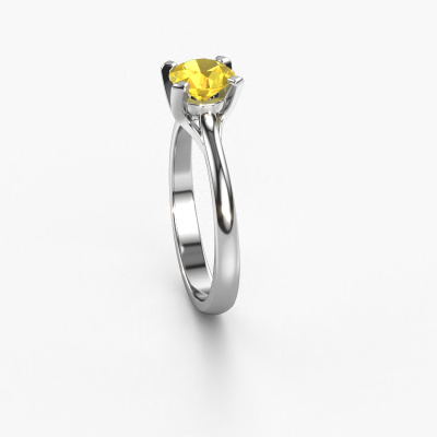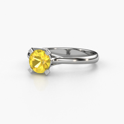 The ring shown above is called the Isa 1. We call this a solitaire ring because it contains a single gemstone. The engagement ring is made in 14 Carat white gold and has a round yellow sapphire of 5.7 mm. This extraordinary classic white gold solitaire engagement ring is set with a beautiful round yellow sapphire to add sparkle to your proposal. The open prong setting allows light to strike the gemstone from various angles. Did you know a diamond represents everlasting love and fidelity? This makes it a perfect centrepiece. Our goldsmith carefully positions the gemstone of your choosing high on top of the ring, which makes it stand out. Each piece of jewellery is made just for you by our master goldsmiths in our own studio.By using a combination of the latest modern techniques, combined with ancient crafting, we can make all our engagement rings in our own studio. Each jewel is made to order. This is advantageous because we can offer you a price you won't find anywhere else.Do you have a specific ring in mind? One you came across somewhere. Please feel free to tell us your wishes and we will turn your design into a unique engagement ring. You can follow the development of your ring design because we use 3D drawings. This gives you a realistic preview of your design. We will gladly send you a non-binding offer, based on a fair price/ quality ratio. It will amaze you.To make it easier for you, we offer a 30 day return policy. Check our terms and conditions.