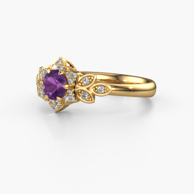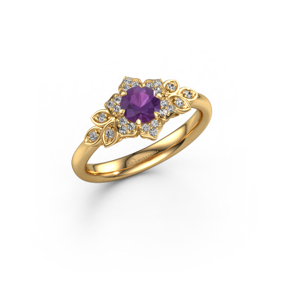 This 14 Carat gold ring is called Tatjana and is set with 5 mm amethyst. An extraordinary gold vintage ring. One that will surely make the love of your life shine like a diamond! That is what we hope to achieve. This vintage engagement ring is set with exquisite amethyst. Whichever gemstone you choose from our selection, is up to you. The gemstone is selected with great care because we believe your graceful engagement ring must be adorned with nothing but the most beautiful gemstone. Wouldn't you agree? Our expert goldsmith will design your ring in our own crafting studio, where the amethyst will be set with great precision. The ring will then be polished till it shines perfectly. Nothing but the best for the love of your life! This jewel is made with passion and love by one of our master goldsmiths.After receiving your order, our goldsmiths will passionately start the creative process of making your engagement ring in our own studio. Because we don't have a big stockpile, these costs will not be passed on to you. Our pricing is proof of that! We offer top quality jewels at lowest price, guaranteed.Have you found a specific engagement ring somewhere which you would like to give to your loved one? Please feel free to express your wishes to our jewel designers because we would be honoured to turn your design into a vintage engagement ring. You can follow the development of your ring design because we use 3D drawings. This gives you a realistic preview of how your design will look. You can also preorder a dummy. A dummy is a plastic ring, which can be shaped according your ring design. You can try it on and check if its width and size are suitable for you. We will gladly send you a non-binding offer, based on a fair price/ quality ratio. It will amaze you, considering the quality of the ring and gemstones.To make it easier for you, we offer a 30 day return policy. Check our terms and conditions.