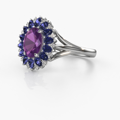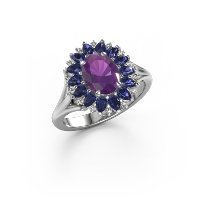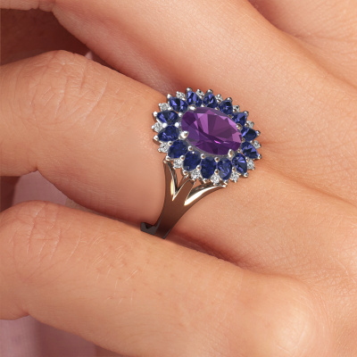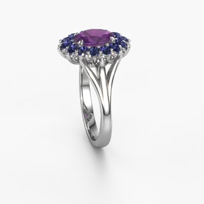 The ring shown above is called the Lidia. We call this type of ring a cluster ring. The centre gemstone is surrounded by smaller sized stones. This 14 Carat white gold version is set with a 8x6 mm oval amethyst centre stone, embraced by smaller sapphire. What makes this vintage white gold cluster ring special is the setting of the smaller gems surrounding the centre amethyst, which are shaped like a beautiful flower. The surrounding cluster of stones frame the middle centre stone in such a way to make it appear bigger. This type of engagement ring is also called a flower ring. It is very important that the smaller sapphire are positioned identically so there is no interference of light but perfect unity instead. Our skilled Goldsmiths get the job done. Each individual stone is carefully set by hand. During manufacturing, light fall is constantly monitored to make sure the special cluster effect is still visible. In the end you get the perfect engagement ring with a radiant amethyst gemstone centrepiece. You can imagine the effect of a ring of such significance when you give tot the love of your life on her special day to shine. This jewel is made with passion and love by one of our master goldsmiths.By using a combination of the latest modern techniques, combined with ancient crafting, we can make all our engagement rings in our own studio. Each jewel is made to order. This is advantageous because we can offer you a price you won't find anywhere else.Have you found a specific engagement ring somewhere which you would like to give to your loved one? Please feel free to express your wishes to our jewel designers because we would be honoured to turn your design into a vintage engagement ring. You can follow the development of your ring design because we use 3D drawings. This gives you a realistic preview of how your design will look. You can also preorder a dummy. A dummy is a plastic ring, which can be shaped according your ring design. You can try it on and check if its width and size are suitable for you. We will gladly send you a non-binding offer, based on a fair price/ quality ratio. It will amaze you, considering the quality of the ring and gemstones.To make it easier for you, we offer a 30 day return policy. Check our terms and conditions.