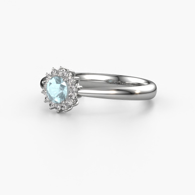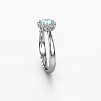 The ring shown above is called the Tilly RND 1. We call this type of ring a cluster ring. The centre gemstone is surrounded by smaller sized stones. This 14 Carat white gold version is set with a 4.2 mm round aquamarine centre stone, embraced by smaller diamonds. What makes this classic white gold cluster ring special is the setting of the smaller gems surrounding the centre aquamarine, which are shaped like a beautiful flower. The surrounding cluster of stones frame the middle centre stone in such a way to make it appear bigger. This type of engagement ring is also called a flower ring. It is very important that the smaller diamonds are positioned identically so there is no interference of light but perfect unity instead. Our skilled Goldsmiths get the job done. Each individual stone is carefully set by hand. During manufacturing, light fall is constantly monitored to make sure the special cluster effect is still visible. In the end you get the perfect engagement ring with a radiant aquamarine gemstone centrepiece. You can imagine the effect of a ring of such significance when you give tot the love of your life on her special day to shine. This jewel is made to shine bright around your finger. Each jewel is hand made with love by our goldsmiths.By using a combination of the latest modern techniques, combined with ancient crafting, we can make all our engagement rings in our own studio. Each jewel is made to order. This is advantageous because we can offer you a price you won't find anywhere else.Our team adds new designs to our online collection daily. Our designers and goldsmiths work together in creating the best design. We strive to offer a diverse collection of jewels. Perhaps you have a specific jewel design in mind. One you came across somewhere. Please contact us for a free consultation. We will make you an offer, based on a fair price/ quality ratio, that will baffle you.To make it easier for you, we offer a 30 day return policy. Check our terms and conditions.