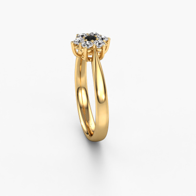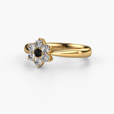 The ring shown above is called the Chantal 1. We call this type of ring a cluster ring. The centre gemstone is surrounded by smaller sized stones. This 14 Carat gold version is set with a 0.066 crt round black diamond centre stone, embraced by smaller diamonds. What makes this traditional gold cluster ring special is the setting of the smaller gems surrounding the centre black diamond, which are shaped like a beautiful flower. The surrounding cluster of stones frame the middle centre stone in such a way to make it appear bigger. This type of promise ring is also called a flower ring. It is very important that the smaller diamonds are positioned identically so there is no interference of light but perfect unity instead. Our skilled Goldsmiths get the job done. Each individual stone is carefully set by hand. During manufacturing, light fall is constantly monitored to make sure the special cluster effect is still visible. In the end you get the perfect promise ring with a radiant black diamond gemstone centrepiece. You can imagine the effect of a ring of such significance when you give tot the love of your life on her special day to shine. This jewel is unique in every way! Simply customize to your liking,By using our modern techniques, we can design and customize the finest quality jewels with the utmost care for you. Our promise ring are always priced 30 percent lower than other jewellers. We make promise ring to order so we don't have to maintain a large stock. If you have a certain budget, we are more than happy to advice you accordingly.Our designers and goldsmiths work together each day, creating new jewels. Perhaps you have found a nice traditional promise ring somewhere, which can be used to customize your unique ring. Please feel free to contact us. We will make you an offer, based on a fair price/ quality ratio, which will amaze you.To make it easier for you, we offer a 30 day return policy. Check our terms and conditions.