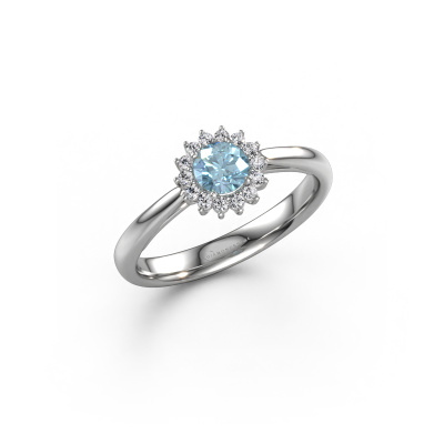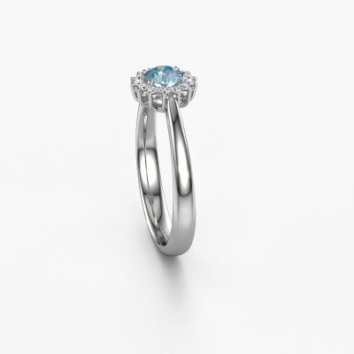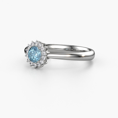 The ring shown above is called the Tilly RND 1. We call this type of ring a cluster ring. The centre gemstone is surrounded by smaller sized stones. This 14 Carat white gold version is set with a 4.2 mm round blue lab grown diamond centre stone, embraced by smaller diamonds. What makes this classic white gold cluster ring special is the setting of the smaller gems surrounding the centre blue lab grown diamond, which are shaped like a beautiful flower. The surrounding cluster of stones frame the middle centre stone in such a way to make it appear bigger. This type of engagement ring is also called a flower ring. It is very important that the smaller diamonds are positioned identically so there is no interference of light but perfect unity instead. Our skilled Goldsmiths get the job done. Each individual stone is carefully set by hand. During manufacturing, light fall is constantly monitored to make sure the special cluster effect is still visible. In the end you get the perfect engagement ring with a radiant blue lab grown diamond gemstone centrepiece. You can imagine the effect of a ring of such significance when you give tot the love of your life on her special day to shine. This jewel is made to shine bright around your finger. Each jewel is hand made with love by our goldsmiths.