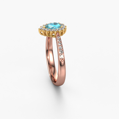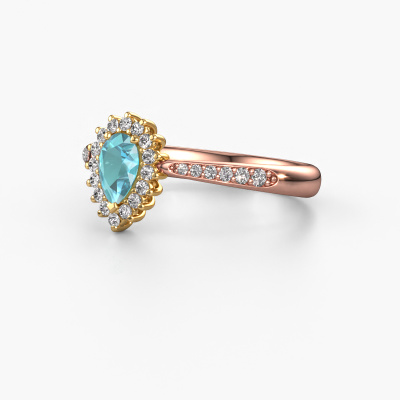The ring shown above is called the Tilly per 2. We call this type of ring a cluster ring. The centre gemstone is surrounded by smaller sized stones. This 14 Carat rose gold version is set with a 6x4 mm pear blue topaz centre stone, embraced by smaller diamonds. What makes this exclusive rose gold cluster ring special is the setting of the smaller gems surrounding the centre blue topaz, which are shaped like a beautiful flower. The surrounding cluster of stones frame the middle centre stone in such a way to make it appear bigger. This type of engagement ring is also called a flower ring. It is very important that the smaller diamonds are positioned identically so there is no interference of light but perfect unity instead. Our skilled Goldsmiths get the job done. Each individual stone is carefully set by hand. During manufacturing, light fall is constantly monitored to make sure the special cluster effect is still visible. In the end you get the perfect engagement ring with a radiant blue topaz gemstone centrepiece. You can imagine the effect of a ring of such significance when you give tot the love of your life on her special day to shine. This jewel is made just for you, with attention to detail and design.After receiving your order, our goldsmiths will passionately start the creative process of making your engagement ring in our own studio. Because we don't have a big stockpile, these costs will not be passed on to you. Our pricing is proof of that! We offer top quality jewels at lowest price, guaranteed.Different styles of new rings are made daily by our team. Perhaps you have found a cluster engagement ring somewhere. One you would like to give to your loved one. Please feel free to share your thoughts and design with our jewel designers. We would love to turn your design into a exclusive engagement ring. You can follow the development of your ring design because we use very detailed 3D drawings. On top of that, you can order a dummy of the design. A dummy is a plastic ring, which can be shaped according your ring design. You can try it on and check if the engagement ring is up to standard. We will gladly send you a non-binding offer, based on a fair price/ quality ratio. The offer will baffle you, considering the quality of the ring and gemstones.To make it easier for you, we offer a 30 day return policy. Check our terms and conditions.
