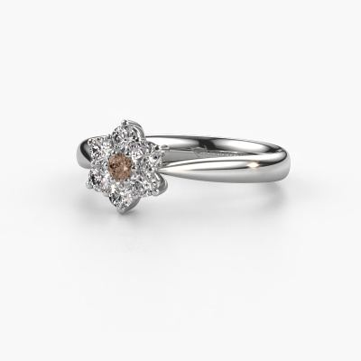 The ring shown above is called the Chantal 1. We call this type of ring a cluster ring. The centre gemstone is surrounded by smaller sized stones. This platinum version is set with a 0.055 crt round brown diamond centre stone, embraced by smaller diamonds. What makes this traditional platinum cluster ring special is the setting of the smaller gems surrounding the centre brown diamond, which are shaped like a beautiful flower. The surrounding cluster of stones frame the middle centre stone in such a way to make it appear bigger. This type of promise ring is also called a flower ring. It is very important that the smaller diamonds are positioned identically so there is no interference of light but perfect unity instead. Our skilled Goldsmiths get the job done. Each individual stone is carefully set by hand. During manufacturing, light fall is constantly monitored to make sure the special cluster effect is still visible. In the end you get the perfect promise ring with a radiant brown diamond gemstone centrepiece. You can imagine the effect of a ring of such significance when you give tot the love of your life on her special day to shine. This jewel is unique in every way! Simply customize to your liking,By using our modern techniques, we can design and customize the finest quality jewels with the utmost care for you. Our promise ring are always priced 30 percent lower than other jewellers. We make promise ring to order so we don't have to maintain a large stock. If you have a certain budget, we are more than happy to advice you accordingly.Our designers and goldsmiths work together each day, creating new jewels. Perhaps you have found a nice traditional promise ring somewhere, which can be used to customize your unique ring. Please feel free to contact us. We will make you an offer, based on a fair price/ quality ratio, which will amaze you.To make it easier for you, we offer a 30 day return policy. Check our terms and conditions.