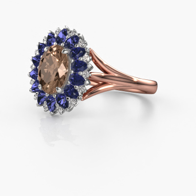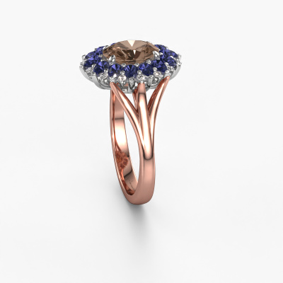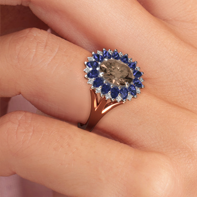 The ring shown above is called the Lidia. We call this type of ring a cluster ring. The centre gemstone is surrounded by smaller sized stones. This 14 Carat rose gold version is set with a 1.10 crt oval brown diamond centre stone, embraced by smaller sapphire. What makes this vintage rose gold cluster ring special is the setting of the smaller gems surrounding the centre brown diamond, which are shaped like a beautiful flower. The surrounding cluster of stones frame the middle centre stone in such a way to make it appear bigger. This type of engagement ring is also called a flower ring. It is very important that the smaller sapphire are positioned identically so there is no interference of light but perfect unity instead. Our skilled Goldsmiths get the job done. Each individual stone is carefully set by hand. During manufacturing, light fall is constantly monitored to make sure the special cluster effect is still visible. In the end you get the perfect engagement ring with a radiant brown diamond gemstone centrepiece. You can imagine the effect of a ring of such significance when you give tot the love of your life on her special day to shine. This jewel is made with passion and love by one of our master goldsmiths.By using a combination of the latest modern techniques, combined with ancient crafting, we can make all our engagement rings in our own studio. Each jewel is made to order. This is advantageous because we can offer you a price you won't find anywhere else.Have you found a specific engagement ring somewhere which you would like to give to your loved one? Please feel free to express your wishes to our jewel designers because we would be honoured to turn your design into a vintage engagement ring. You can follow the development of your ring design because we use 3D drawings. This gives you a realistic preview of how your design will look. You can also preorder a dummy. A dummy is a plastic ring, which can be shaped according your ring design. You can try it on and check if its width and size are suitable for you. We will gladly send you a non-binding offer, based on a fair price/ quality ratio. It will amaze you, considering the quality of the ring and gemstones.To make it easier for you, we offer a 30 day return policy. Check our terms and conditions.