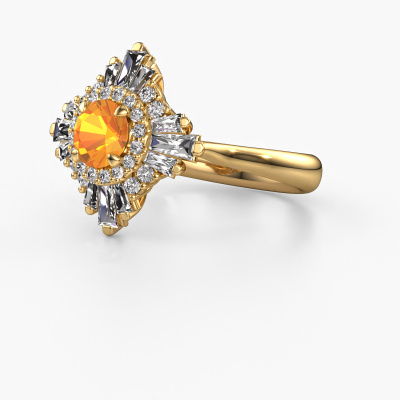 This 14 Carat gold ring is called Thalia and is set with 5.4 mm citrin. An extraordinary gold vintage ring. One that will surely make the love of your life shine like a diamond! That is what we hope to achieve. This vintage engagement ring is set with exquisite citrin. Whichever gemstone you choose from our selection, is up to you. The gemstone is selected with great care because we believe your special engagement ring must be adorned with nothing but the most beautiful gemstone. Wouldn't you agree? Our expert goldsmith will design your ring in our own crafting studio, where the citrin will be set with great precision. The ring will then be polished till it shines perfectly. Nothing but the best for the love of your life! This jewel is made with passion and love by one of our master goldsmiths.After receiving your order, our goldsmiths will passionately start the creative process of making your engagement ring in our own studio. Because we don't have a big stockpile, these costs will not be passed on to you. Our pricing is proof of that! We offer top quality jewels at lowest price, guaranteed.Have you found a specific engagement ring somewhere which you would like to give to your loved one? Please feel free to express your wishes to our jewel designers because we would be honoured to turn your design into a vintage engagement ring. You can follow the development of your ring design because we use 3D drawings. This gives you a realistic preview of how your design will look. You can also preorder a dummy. A dummy is a plastic ring, which can be shaped according your ring design. You can try it on and check if its width and size are suitable for you. We will gladly send you a non-binding offer, based on a fair price/ quality ratio. It will amaze you, considering the quality of the ring and gemstones.To make it easier for you, we offer a 30 day return policy. Check our terms and conditions.