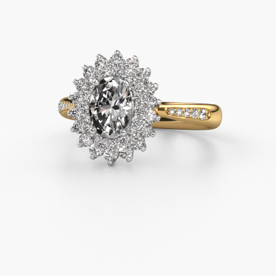 The ring shown above is called the Alina 2. We call this type of ring a cluster ring. The centre gemstone is surrounded by smaller sized stones. This 14 Carat gold version is set with a 7x5 mm oval custom diamond centre stone, embraced by smaller diamonds. What makes this exclusive gold cluster ring special is the setting of the smaller gems surrounding the centre custom diamond, which are shaped like a beautiful flower. The surrounding cluster of stones frame the middle centre stone in such a way to make it appear bigger. This type of engagement ring is also called a flower ring. It is very important that the smaller diamonds are positioned identically so there is no interference of light but perfect unity instead. Our skilled Goldsmiths get the job done. Each individual stone is carefully set by hand. During manufacturing, light fall is constantly monitored to make sure the special cluster effect is still visible. In the end you get the perfect engagement ring with a radiant custom diamond gemstone centrepiece. You can imagine the effect of a ring of such significance when you give tot the love of your life on her special day to shine. This jewel is made just for you, with attention to detail and design.By using a combination of the latest modern techniques, combined with ancient crafting, we can make all our engagement rings in our own studio. Each jewel is made to order. This is advantageous because we can offer you a price you won't find anywhere else.Have you found a specific engagement ring somewhere which you would like to give to your loved one? Please feel free to express your wishes to our jewel designers because we would be honoured to turn your design into a exclusive engagement ring. You can follow the development of your ring design because we use 3D drawings. This gives you a realistic preview of how your design will look. You can also preorder a dummy. A dummy is a plastic ring, which can be shaped according your ring design. You can try it on and check if its width and size are suitable for you. We will gladly send you a non-binding offer, based on a fair price/ quality ratio. It will amaze you, considering the quality of the ring and gemstones.To make it easier for you, we offer a 30 day return policy. Check our terms and conditions.
