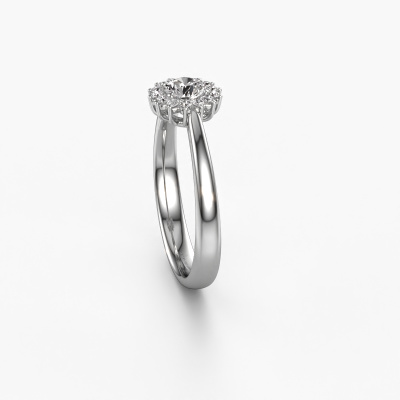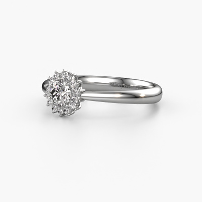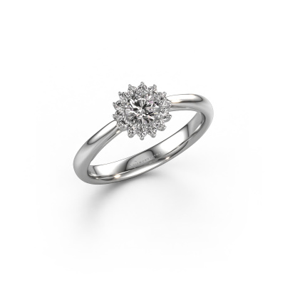 The ring shown above is called the Tilly RND 1. We call this type of ring a cluster ring. The centre gemstone is surrounded by smaller sized stones. This 14 Carat white gold version is set with a 0.25 crt round diamond centre stone, embraced by smaller diamonds. What makes this classic white gold cluster ring special is the setting of the smaller gems surrounding the centre diamond, which are shaped like a beautiful flower. The surrounding cluster of stones frame the middle centre stone in such a way to make it appear bigger. This type of engagement ring is also called a flower ring. It is very important that the smaller diamonds are positioned identically so there is no interference of light but perfect unity instead. Our skilled Goldsmiths get the job done. Each individual stone is carefully set by hand. During manufacturing, light fall is constantly monitored to make sure the special cluster effect is still visible. In the end you get the perfect engagement ring with a radiant diamond gemstone centrepiece. You can imagine the effect of a ring of such significance when you give tot the love of your life on her special day to shine. This jewel is made to shine bright around your finger. Each jewel is hand made with love by our goldsmiths.By using a combination of the latest modern techniques, combined with ancient crafting, we can make all our engagement rings in our own studio. Each jewel is made to order. This is advantageous because we can offer you a price you won't find anywhere else.Our team adds new designs to our online collection daily. Our designers and goldsmiths work together in creating the best design. We strive to offer a diverse collection of jewels. Perhaps you have a specific jewel design in mind. One you came across somewhere. Please contact us for a free consultation. We will make you an offer, based on a fair price/ quality ratio, that will baffle you.To make it easier for you, we offer a 30 day return policy. Check our terms and conditions.
