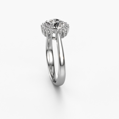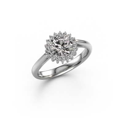 The ring shown above is called the Tilly RND 1. We call this type of ring a cluster ring. The centre gemstone is surrounded by smaller sized stones. This 14 Carat white gold version is set with a 1.00 crt round diamond centre stone, embraced by smaller diamonds. What makes this classic white gold cluster ring special is the setting of the smaller gems surrounding the centre diamond, which are shaped like a beautiful flower. The surrounding cluster of stones frame the middle centre stone in such a way to make it appear bigger. This type of engagement ring is also called a flower ring. It is very important that the smaller diamonds are positioned identically so there is no interference of light but perfect unity instead. Our skilled Goldsmiths get the job done. Each individual stone is carefully set by hand. During manufacturing, light fall is constantly monitored to make sure the special cluster effect is still visible. In the end you get the perfect engagement ring with a radiant diamond gemstone centrepiece. You can imagine the effect of a ring of such significance when you give tot the love of your life on her special day to shine. This jewel is made to shine bright around your finger. Each jewel is hand made with love by our goldsmiths.By using a combination of the latest modern techniques, combined with ancient crafting, we can make all our engagement rings in our own studio. Each jewel is made to order. This is advantageous because we can offer you a price you won't find anywhere else.Our team adds new designs to our online collection daily. Our designers and goldsmiths work together in creating the best design. We strive to offer a diverse collection of jewels. Perhaps you have a specific jewel design in mind. One you came across somewhere. Please contact us for a free consultation. We will make you an offer, based on a fair price/ quality ratio, that will baffle you.To make it easier for you, we offer a 30 day return policy. Check our terms and conditions.