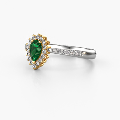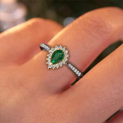 The ring shown above is called the Tilly per 2. We call this type of ring a cluster ring. The centre gemstone is surrounded by smaller sized stones. This 14 Carat white gold version is set with a 6x4 mm pear emerald centre stone, embraced by smaller diamonds. What makes this exclusive white gold cluster ring special is the setting of the smaller gems surrounding the centre emerald, which are shaped like a beautiful flower. The surrounding cluster of stones frame the middle centre stone in such a way to make it appear bigger. This type of engagement ring is also called a flower ring. It is very important that the smaller diamonds are positioned identically so there is no interference of light but perfect unity instead. Our skilled Goldsmiths get the job done. Each individual stone is carefully set by hand. During manufacturing, light fall is constantly monitored to make sure the special cluster effect is still visible. In the end you get the perfect engagement ring with a radiant emerald gemstone centrepiece. You can imagine the effect of a ring of such significance when you give tot the love of your life on her special day to shine. This jewel is made just for you, with attention to detail and design.After receiving your order, our goldsmiths will passionately start the creative process of making your engagement ring in our own studio. Because we don't have a big stockpile, these costs will not be passed on to you. Our pricing is proof of that! We offer top quality jewels at lowest price, guaranteed.Different styles of new rings are made daily by our team. Perhaps you have found a cluster engagement ring somewhere. One you would like to give to your loved one. Please feel free to share your thoughts and design with our jewel designers. We would love to turn your design into a exclusive engagement ring. You can follow the development of your ring design because we use very detailed 3D drawings. On top of that, you can order a dummy of the design. A dummy is a plastic ring, which can be shaped according your ring design. You can try it on and check if the engagement ring is up to standard. We will gladly send you a non-binding offer, based on a fair price/ quality ratio. The offer will baffle you, considering the quality of the ring and gemstones.To make it easier for you, we offer a 30 day return policy. Check our terms and conditions.