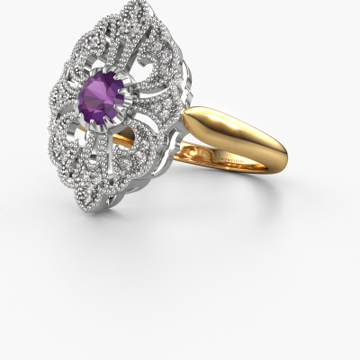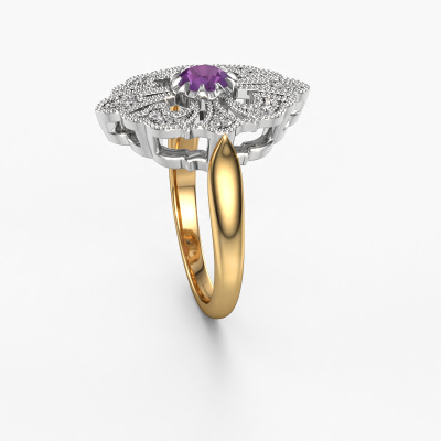 This 14 Carat gold ring is called Naida and is set with 5 mm amethyst. Is your girlfriend hooked on vintage? Then this gold graceful engagement ring will surely match her style perfectly. A trendy ring with just a hint of vintage adornment. A truly stunning, romantic design! Especially when you customize your ring to your own liking. This vintage cluster engagement ring is set with stunning amethysten. As you can see, you are the boss in selecting a gemstone which matches the style of your girlfriend best. Each gemstone is carefully selected by our merchants whom are spread throughout the world. Nothing but the best gems for our expert goldsmith. After all, it is his crowning glory! Each jewel is made just for you by our master goldsmiths in our own studio.By using a combination of the latest modern techniques, combined with ancient crafting, we can make all our engagement rings in our own studio. Each jewel is made to order. This is advantageous because we can offer you a price you won't find anywhere else.Do you have a specific ring in mind? One you came across somewhere. Please feel free to tell us your wishes and we will turn your design into a unique engagement ring. You can follow the development of your ring design because we use 3D drawings. This gives you a realistic preview of your design. We will gladly send you a non-binding offer, based on a fair price/ quality ratio. It will amaze you.To make it easier for you, we offer a 30 day return policy. Check our terms and conditions.