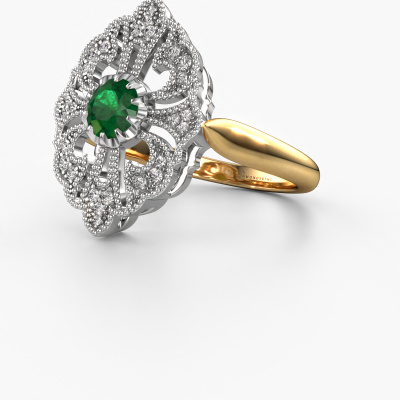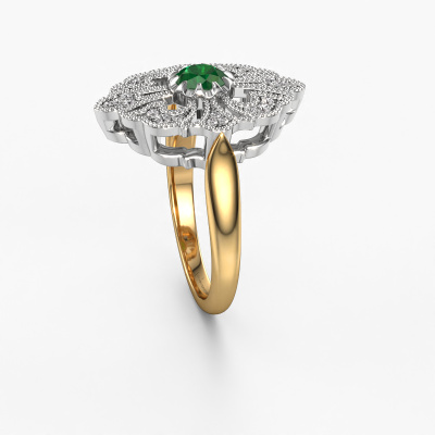 This 14 Carat gold ring is called Naida and is set with 5 mm emerald. Is your girlfriend hooked on vintage? Then this gold graceful engagement ring will surely match her style perfectly. A trendy ring with just a hint of vintage adornment. A truly stunning, romantic design! Especially when you customize your ring to your own liking. This vintage cluster engagement ring is set with stunning emerald. As you can see, you are the boss in selecting a gemstone which matches the style of your girlfriend best. Each gemstone is carefully selected by our merchants whom are spread throughout the world. Nothing but the best gems for our expert goldsmith. After all, it is his crowning glory! Each jewel is made just for you by our master goldsmiths in our own studio.By using a combination of the latest modern techniques, combined with ancient crafting, we can make all our engagement rings in our own studio. Each jewel is made to order. This is advantageous because we can offer you a price you won't find anywhere else.Do you have a specific ring in mind? One you came across somewhere. Please feel free to tell us your wishes and we will turn your design into a unique engagement ring. You can follow the development of your ring design because we use 3D drawings. This gives you a realistic preview of your design. We will gladly send you a non-binding offer, based on a fair price/ quality ratio. It will amaze you.To make it easier for you, we offer a 30 day return policy. Check our terms and conditions.