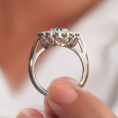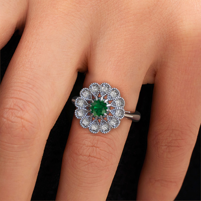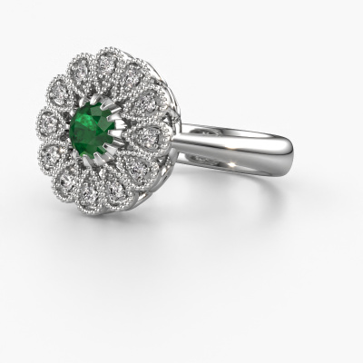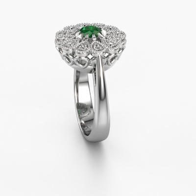 This platinum ring is called Kaat and is set with 5 mm emerald. Is your girlfriend hooked on vintage? Then this platinum pearl edges engagement ring will surely match her style perfectly. A trendy ring with just a hint of vintage adornment. A truly stunning, romantic design! Especially when you customize your ring to your own liking. This vintage cluster engagement ring is set with stunning emerald. As you can see, you are the boss in selecting a gemstone which matches the style of your girlfriend best. Each gemstone is carefully selected by our merchants whom are spread throughout the world. Nothing but the best gems for our expert goldsmith. After all, it is his crowning glory! Each jewel is created to add sparkle to your finger, each jewel is lovingly made by hand by our goldsmiths.Because we design and deliver our own rings, we can offer you a engagement ring at a price you won't find anywhere else. A ring is made to order, which helps prevent excess supplies, so we can make you a great price offer. We understand it feels risky, buying your engagement ring online, but we will gladly assist in the designing process, taking your budget into consideration.Our team adds new designs to our online collection daily. Our designers and goldsmiths work together in creating the best design. We strive to offer a diverse collection of jewels. Perhaps you have a specific jewel design in mind. One you came across somewhere. Please contact us for a free consultation. We will make you an offer, based on a fair price/ quality ratio, that will baffle you.To make it easier for you, we offer a 30 day return policy. Check our terms and conditions.