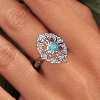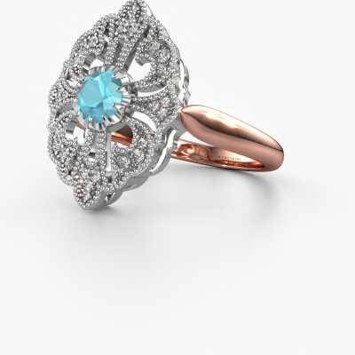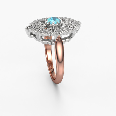 This 14 Carat rose gold ring is called Naida and is set with 5 mm blue topaz. Is your girlfriend hooked on vintage? Then this rose gold graceful engagement ring will surely match her style perfectly. A trendy ring with just a hint of vintage adornment. A truly stunning, romantic design! Especially when you customize your ring to your own liking. This vintage cluster engagement ring is set with stunning blue topaz. As you can see, you are the boss in selecting a gemstone which matches the style of your girlfriend best. Each gemstone is carefully selected by our merchants whom are spread throughout the world. Nothing but the best gems for our expert goldsmith. After all, it is his crowning glory! Each jewel is made just for you by our master goldsmiths in our own studio.By using a combination of the latest modern techniques, combined with ancient crafting, we can make all our engagement rings in our own studio. Each jewel is made to order. This is advantageous because we can offer you a price you won't find anywhere else.Do you have a specific ring in mind? One you came across somewhere. Please feel free to tell us your wishes and we will turn your design into a unique engagement ring. You can follow the development of your ring design because we use 3D drawings. This gives you a realistic preview of your design. We will gladly send you a non-binding offer, based on a fair price/ quality ratio. It will amaze you.To make it easier for you, we offer a 30 day return policy. Check our terms and conditions.