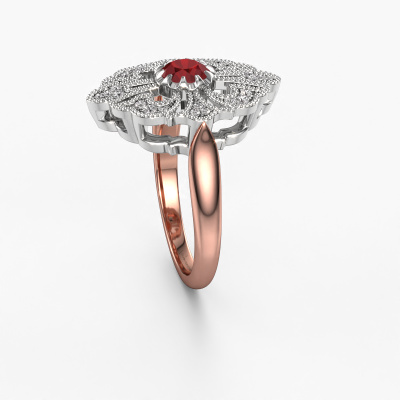 This 14 Carat rose gold ring is called Naida and is set with 5 mm ruby. Is your girlfriend hooked on vintage? Then this rose gold graceful engagement ring will surely match her style perfectly. A trendy ring with just a hint of vintage adornment. A truly stunning, romantic design! Especially when you customize your ring to your own liking. This vintage cluster engagement ring is set with stunning ruby. As you can see, you are the boss in selecting a gemstone which matches the style of your girlfriend best. Each gemstone is carefully selected by our merchants whom are spread throughout the world. Nothing but the best gems for our expert goldsmith. After all, it is his crowning glory! Each jewel is made just for you by our master goldsmiths in our own studio.By using a combination of the latest modern techniques, combined with ancient crafting, we can make all our engagement rings in our own studio. Each jewel is made to order. This is advantageous because we can offer you a price you won't find anywhere else.Do you have a specific ring in mind? One you came across somewhere. Please feel free to tell us your wishes and we will turn your design into a unique engagement ring. You can follow the development of your ring design because we use 3D drawings. This gives you a realistic preview of your design. We will gladly send you a non-binding offer, based on a fair price/ quality ratio. It will amaze you.To make it easier for you, we offer a 30 day return policy. Check our terms and conditions.