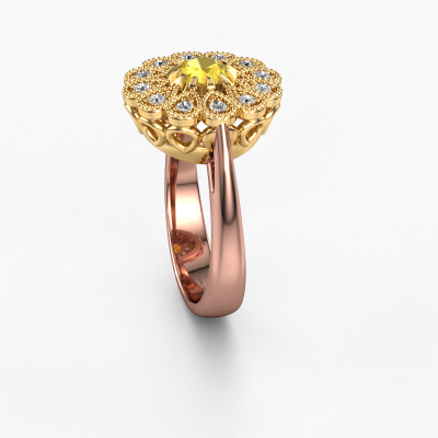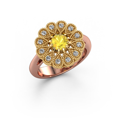 This 14 Carat rose gold ring is called Kaat and is set with 5 mm yellow sapphire. Is your girlfriend hooked on vintage? Then this rose gold pearl edges engagement ring will surely match her style perfectly. A trendy ring with just a hint of vintage adornment. A truly stunning, romantic design! Especially when you customize your ring to your own liking. This vintage cluster engagement ring is set with stunning yellow sapphire. As you can see, you are the boss in selecting a gemstone which matches the style of your girlfriend best. Each gemstone is carefully selected by our merchants whom are spread throughout the world. Nothing but the best gems for our expert goldsmith. After all, it is his crowning glory! Each jewel is created to add sparkle to your finger, each jewel is lovingly made by hand by our goldsmiths.Because we design and deliver our own rings, we can offer you a engagement ring at a price you won't find anywhere else. A ring is made to order, which helps prevent excess supplies, so we can make you a great price offer. We understand it feels risky, buying your engagement ring online, but we will gladly assist in the designing process, taking your budget into consideration.Our team adds new designs to our online collection daily. Our designers and goldsmiths work together in creating the best design. We strive to offer a diverse collection of jewels. Perhaps you have a specific jewel design in mind. One you came across somewhere. Please contact us for a free consultation. We will make you an offer, based on a fair price/ quality ratio, that will baffle you.To make it easier for you, we offer a 30 day return policy. Check our terms and conditions.