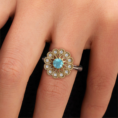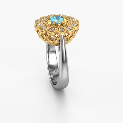 This 14 Carat white gold ring is called Kaat and is set with 5 mm blue topaz. Is your girlfriend hooked on vintage? Then this white gold pearl edges engagement ring will surely match her style perfectly. A trendy ring with just a hint of vintage adornment. A truly stunning, romantic design! Especially when you customize your ring to your own liking. This vintage cluster engagement ring is set with stunning blue topaz. As you can see, you are the boss in selecting a gemstone which matches the style of your girlfriend best. Each gemstone is carefully selected by our merchants whom are spread throughout the world. Nothing but the best gems for our expert goldsmith. After all, it is his crowning glory! Each jewel is created to add sparkle to your finger, each jewel is lovingly made by hand by our goldsmiths.Because we design and deliver our own rings, we can offer you a engagement ring at a price you won't find anywhere else. A ring is made to order, which helps prevent excess supplies, so we can make you a great price offer. We understand it feels risky, buying your engagement ring online, but we will gladly assist in the designing process, taking your budget into consideration.Our team adds new designs to our online collection daily. Our designers and goldsmiths work together in creating the best design. We strive to offer a diverse collection of jewels. Perhaps you have a specific jewel design in mind. One you came across somewhere. Please contact us for a free consultation. We will make you an offer, based on a fair price/ quality ratio, that will baffle you.To make it easier for you, we offer a 30 day return policy. Check our terms and conditions.