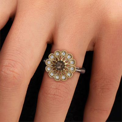 This 14 Carat white gold ring is called Kaat and is set with 5 mm smokey quartz. Is your girlfriend hooked on vintage? Then this white gold pearl edges engagement ring will surely match her style perfectly. A trendy ring with just a hint of vintage adornment. A truly stunning, romantic design! Especially when you customize your ring to your own liking. This vintage cluster engagement ring is set with stunning smokey quartz. As you can see, you are the boss in selecting a gemstone which matches the style of your girlfriend best. Each gemstone is carefully selected by our merchants whom are spread throughout the world. Nothing but the best gems for our expert goldsmith. After all, it is his crowning glory! Each jewel is created to add sparkle to your finger, each jewel is lovingly made by hand by our goldsmiths.Because we design and deliver our own rings, we can offer you a engagement ring at a price you won't find anywhere else. A ring is made to order, which helps prevent excess supplies, so we can make you a great price offer. We understand it feels risky, buying your engagement ring online, but we will gladly assist in the designing process, taking your budget into consideration.Our team adds new designs to our online collection daily. Our designers and goldsmiths work together in creating the best design. We strive to offer a diverse collection of jewels. Perhaps you have a specific jewel design in mind. One you came across somewhere. Please contact us for a free consultation. We will make you an offer, based on a fair price/ quality ratio, that will baffle you.To make it easier for you, we offer a 30 day return policy. Check our terms and conditions.