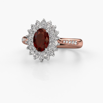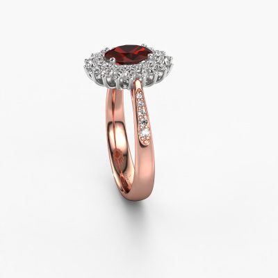 The ring shown above is called the Alina 2. We call this type of ring a cluster ring. The centre gemstone is surrounded by smaller sized stones. This 14 Carat rose gold version is set with a 7x5 mm oval garnet centre stone, embraced by smaller diamonds. What makes this exclusive rose gold cluster ring special is the setting of the smaller gems surrounding the centre garnet, which are shaped like a beautiful flower. The surrounding cluster of stones frame the middle centre stone in such a way to make it appear bigger. This type of engagement ring is also called a flower ring. It is very important that the smaller diamonds are positioned identically so there is no interference of light but perfect unity instead. Our skilled Goldsmiths get the job done. Each individual stone is carefully set by hand. During manufacturing, light fall is constantly monitored to make sure the special cluster effect is still visible. In the end you get the perfect engagement ring with a radiant garnet gemstone centrepiece. You can imagine the effect of a ring of such significance when you give tot the love of your life on her special day to shine. This jewel is made just for you, with attention to detail and design.By using a combination of the latest modern techniques, combined with ancient crafting, we can make all our engagement rings in our own studio. Each jewel is made to order. This is advantageous because we can offer you a price you won't find anywhere else.Have you found a specific engagement ring somewhere which you would like to give to your loved one? Please feel free to express your wishes to our jewel designers because we would be honoured to turn your design into a exclusive engagement ring. You can follow the development of your ring design because we use 3D drawings. This gives you a realistic preview of how your design will look. You can also preorder a dummy. A dummy is a plastic ring, which can be shaped according your ring design. You can try it on and check if its width and size are suitable for you. We will gladly send you a non-binding offer, based on a fair price/ quality ratio. It will amaze you, considering the quality of the ring and gemstones.To make it easier for you, we offer a 30 day return policy. Check our terms and conditions.