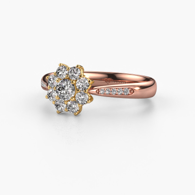 The ring shown above is called the Carolyn 2. We call this type of ring a cluster ring. The centre gemstone is surrounded by smaller sized stones. This 14 Carat rose gold version is set with a 0.15 crt round lab grown diamond centre stone, embraced by smaller diamonds. What makes this traditional rose gold cluster ring special is the setting of the smaller gems surrounding the centre lab grown diamond, which are shaped like a beautiful flower. The surrounding cluster of stones frame the middle centre stone in such a way to make it appear bigger. This type of engagement ring is also called a flower ring. It is very important that the smaller diamonds are positioned identically so there is no interference of light but perfect unity instead. Our skilled Goldsmiths get the job done. Each individual stone is carefully set by hand. During manufacturing, light fall is constantly monitored to make sure the special cluster effect is still visible. In the end you get the perfect engagement ring with a radiant lab grown diamond gemstone centrepiece. You can imagine the effect of a ring of such significance when you give tot the love of your life on her special day to shine. This jewel is unique in every way! Simply customize to your liking,Are you on a budget? Please feel free to contact us, so we can go discuss your options. We offer our engagement rings at guaranteed best price, because we make them to order. You won't find such a price anywhere else!Our team adds new designs to our online collection daily. Our designers and goldsmiths work together in creating the best design. We strive to offer a diverse collection of jewels. Perhaps you have a specific jewel design in mind. One you came across somewhere. Please contact us for a free consultation. We will make you an offer, based on a fair price/ quality ratio, that will baffle you.To make it easier for you, we offer a 30 day return policy. Check our terms and conditions.