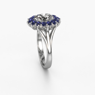 The ring shown above is called the Lidia. We call this type of ring a cluster ring. The centre gemstone is surrounded by smaller sized stones. This 14 Carat white gold version is set with a 1.10 crt oval lab grown diamond centre stone, embraced by smaller sapphire. What makes this vintage white gold cluster ring special is the setting of the smaller gems surrounding the centre lab grown diamond, which are shaped like a beautiful flower. The surrounding cluster of stones frame the middle centre stone in such a way to make it appear bigger. This type of engagement ring is also called a flower ring. It is very important that the smaller sapphire are positioned identically so there is no interference of light but perfect unity instead. Our skilled Goldsmiths get the job done. Each individual stone is carefully set by hand. During manufacturing, light fall is constantly monitored to make sure the special cluster effect is still visible. In the end you get the perfect engagement ring with a radiant lab grown diamond gemstone centrepiece. You can imagine the effect of a ring of such significance when you give tot the love of your life on her special day to shine. This jewel is made with passion and love by one of our master goldsmiths.By using a combination of the latest modern techniques, combined with ancient crafting, we can make all our engagement rings in our own studio. Each jewel is made to order. This is advantageous because we can offer you a price you won't find anywhere else.Have you found a specific engagement ring somewhere which you would like to give to your loved one? Please feel free to express your wishes to our jewel designers because we would be honoured to turn your design into a vintage engagement ring. You can follow the development of your ring design because we use 3D drawings. This gives you a realistic preview of how your design will look. You can also preorder a dummy. A dummy is a plastic ring, which can be shaped according your ring design. You can try it on and check if its width and size are suitable for you. We will gladly send you a non-binding offer, based on a fair price/ quality ratio. It will amaze you, considering the quality of the ring and gemstones.To make it easier for you, we offer a 30 day return policy. Check our terms and conditions.