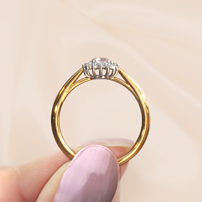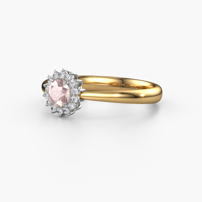 The ring shown above is called the Tilly RND 1. We call this type of ring a cluster ring. The centre gemstone is surrounded by smaller sized stones. This 14 Carat gold version is set with a 4.2 mm round morganite champagne centre stone, embraced by smaller diamonds. What makes this classic gold cluster ring special is the setting of the smaller gems surrounding the centre morganite champagne, which are shaped like a beautiful flower. The surrounding cluster of stones frame the middle centre stone in such a way to make it appear bigger. This type of engagement ring is also called a flower ring. It is very important that the smaller diamonds are positioned identically so there is no interference of light but perfect unity instead. Our skilled Goldsmiths get the job done. Each individual stone is carefully set by hand. During manufacturing, light fall is constantly monitored to make sure the special cluster effect is still visible. In the end you get the perfect engagement ring with a radiant morganite champagne gemstone centrepiece. You can imagine the effect of a ring of such significance when you give tot the love of your life on her special day to shine. This jewel is made to shine bright around your finger. Each jewel is hand made with love by our goldsmiths.By using a combination of the latest modern techniques, combined with ancient crafting, we can make all our engagement rings in our own studio. Each jewel is made to order. This is advantageous because we can offer you a price you won't find anywhere else.Our team adds new designs to our online collection daily. Our designers and goldsmiths work together in creating the best design. We strive to offer a diverse collection of jewels. Perhaps you have a specific jewel design in mind. One you came across somewhere. Please contact us for a free consultation. We will make you an offer, based on a fair price/ quality ratio, that will baffle you.To make it easier for you, we offer a 30 day return policy. Check our terms and conditions.