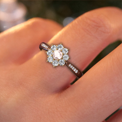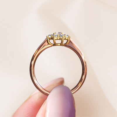 The ring shown above is called the Carolyn 2. We call this type of ring a cluster ring. The centre gemstone is surrounded by smaller sized stones. This 14 Carat rose gold version is set with a 3.4 mm round morganite champagne centre stone, embraced by smaller diamonds. What makes this traditional rose gold cluster ring special is the setting of the smaller gems surrounding the centre morganite champagne, which are shaped like a beautiful flower. The surrounding cluster of stones frame the middle centre stone in such a way to make it appear bigger. This type of engagement ring is also called a flower ring. It is very important that the smaller diamonds are positioned identically so there is no interference of light but perfect unity instead. Our skilled Goldsmiths get the job done. Each individual stone is carefully set by hand. During manufacturing, light fall is constantly monitored to make sure the special cluster effect is still visible. In the end you get the perfect engagement ring with a radiant morganite champagne gemstone centrepiece. You can imagine the effect of a ring of such significance when you give tot the love of your life on her special day to shine. This jewel is unique in every way! Simply customize to your liking,