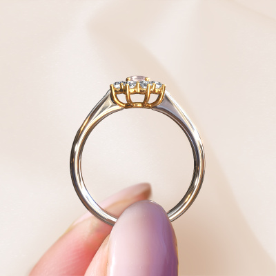 The ring shown above is called the Carolyn 2. We call this type of ring a cluster ring. The centre gemstone is surrounded by smaller sized stones. This 14 Carat white gold version is set with a 3.4 mm round morganite champagne centre stone, embraced by smaller diamonds. What makes this traditional white gold cluster ring special is the setting of the smaller gems surrounding the centre morganite champagne, which are shaped like a beautiful flower. The surrounding cluster of stones frame the middle centre stone in such a way to make it appear bigger. This type of engagement ring is also called a flower ring. It is very important that the smaller diamonds are positioned identically so there is no interference of light but perfect unity instead. Our skilled Goldsmiths get the job done. Each individual stone is carefully set by hand. During manufacturing, light fall is constantly monitored to make sure the special cluster effect is still visible. In the end you get the perfect engagement ring with a radiant morganite champagne gemstone centrepiece. You can imagine the effect of a ring of such significance when you give tot the love of your life on her special day to shine. This jewel is unique in every way! Simply customize to your liking,