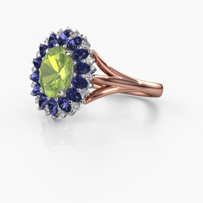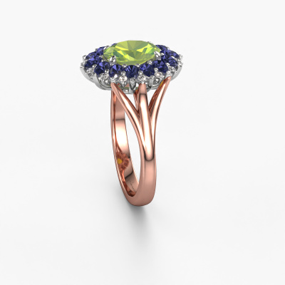 The ring shown above is called the Lidia. We call this type of ring a cluster ring. The centre gemstone is surrounded by smaller sized stones. This 14 Carat rose gold version is set with a 8x6 mm oval peridot centre stone, embraced by smaller sapphire. What makes this vintage rose gold cluster ring special is the setting of the smaller gems surrounding the centre peridot, which are shaped like a beautiful flower. The surrounding cluster of stones frame the middle centre stone in such a way to make it appear bigger. This type of engagement ring is also called a flower ring. It is very important that the smaller sapphire are positioned identically so there is no interference of light but perfect unity instead. Our skilled Goldsmiths get the job done. Each individual stone is carefully set by hand. During manufacturing, light fall is constantly monitored to make sure the special cluster effect is still visible. In the end you get the perfect engagement ring with a radiant peridot gemstone centrepiece. You can imagine the effect of a ring of such significance when you give tot the love of your life on her special day to shine. This jewel is made with passion and love by one of our master goldsmiths.By using a combination of the latest modern techniques, combined with ancient crafting, we can make all our engagement rings in our own studio. Each jewel is made to order. This is advantageous because we can offer you a price you won't find anywhere else.Have you found a specific engagement ring somewhere which you would like to give to your loved one? Please feel free to express your wishes to our jewel designers because we would be honoured to turn your design into a vintage engagement ring. You can follow the development of your ring design because we use 3D drawings. This gives you a realistic preview of how your design will look. You can also preorder a dummy. A dummy is a plastic ring, which can be shaped according your ring design. You can try it on and check if its width and size are suitable for you. We will gladly send you a non-binding offer, based on a fair price/ quality ratio. It will amaze you, considering the quality of the ring and gemstones.To make it easier for you, we offer a 30 day return policy. Check our terms and conditions.