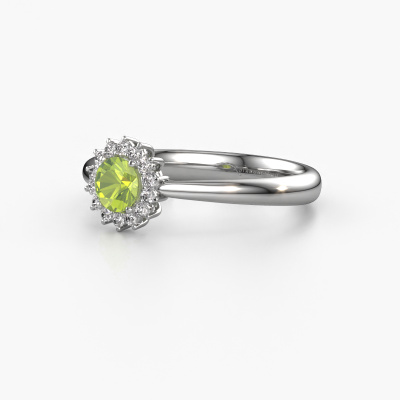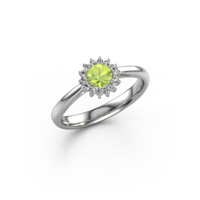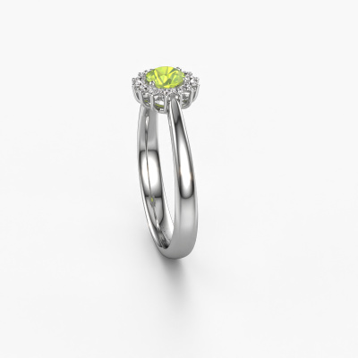 The ring shown above is called the Tilly RND 1. We call this type of ring a cluster ring. The centre gemstone is surrounded by smaller sized stones. This 14 Carat white gold version is set with a 4.2 mm round peridot centre stone, embraced by smaller diamonds. What makes this classic white gold cluster ring special is the setting of the smaller gems surrounding the centre peridot, which are shaped like a beautiful flower. The surrounding cluster of stones frame the middle centre stone in such a way to make it appear bigger. This type of engagement ring is also called a flower ring. It is very important that the smaller diamonds are positioned identically so there is no interference of light but perfect unity instead. Our skilled Goldsmiths get the job done. Each individual stone is carefully set by hand. During manufacturing, light fall is constantly monitored to make sure the special cluster effect is still visible. In the end you get the perfect engagement ring with a radiant peridot gemstone centrepiece. You can imagine the effect of a ring of such significance when you give tot the love of your life on her special day to shine. This jewel is made to shine bright around your finger. Each jewel is hand made with love by our goldsmiths.By using a combination of the latest modern techniques, combined with ancient crafting, we can make all our engagement rings in our own studio. Each jewel is made to order. This is advantageous because we can offer you a price you won't find anywhere else.Our team adds new designs to our online collection daily. Our designers and goldsmiths work together in creating the best design. We strive to offer a diverse collection of jewels. Perhaps you have a specific jewel design in mind. One you came across somewhere. Please contact us for a free consultation. We will make you an offer, based on a fair price/ quality ratio, that will baffle you.To make it easier for you, we offer a 30 day return policy. Check our terms and conditions.