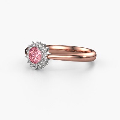 The ring shown above is called the Tilly RND 1. We call this type of ring a cluster ring. The centre gemstone is surrounded by smaller sized stones. This 14 Carat rose gold version is set with a 4.2 mm round pink lab grown diamond centre stone, embraced by smaller diamonds. What makes this classic rose gold cluster ring special is the setting of the smaller gems surrounding the centre pink lab grown diamond, which are shaped like a beautiful flower. The surrounding cluster of stones frame the middle centre stone in such a way to make it appear bigger. This type of engagement ring is also called a flower ring. It is very important that the smaller diamonds are positioned identically so there is no interference of light but perfect unity instead. Our skilled Goldsmiths get the job done. Each individual stone is carefully set by hand. During manufacturing, light fall is constantly monitored to make sure the special cluster effect is still visible. In the end you get the perfect engagement ring with a radiant pink lab grown diamond gemstone centrepiece. You can imagine the effect of a ring of such significance when you give tot the love of your life on her special day to shine. This jewel is made to shine bright around your finger. Each jewel is hand made with love by our goldsmiths.