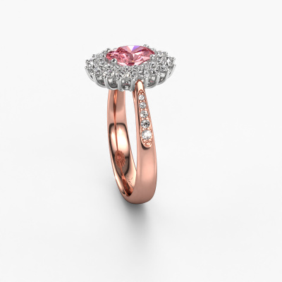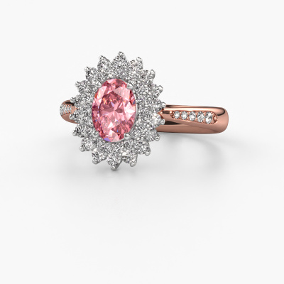 The ring shown above is called the Alina 2. We call this type of ring a cluster ring. The centre gemstone is surrounded by smaller sized stones. This 14 Carat rose gold version is set with a 7x5 mm oval pink lab grown diamond centre stone, embraced by smaller diamonds. What makes this exclusive rose gold cluster ring special is the setting of the smaller gems surrounding the centre pink lab grown diamond, which are shaped like a beautiful flower. The surrounding cluster of stones frame the middle centre stone in such a way to make it appear bigger. This type of engagement ring is also called a flower ring. It is very important that the smaller diamonds are positioned identically so there is no interference of light but perfect unity instead. Our skilled Goldsmiths get the job done. Each individual stone is carefully set by hand. During manufacturing, light fall is constantly monitored to make sure the special cluster effect is still visible. In the end you get the perfect engagement ring with a radiant pink lab grown diamond gemstone centrepiece. You can imagine the effect of a ring of such significance when you give tot the love of your life on her special day to shine. This jewel is made just for you, with attention to detail and design.By using a combination of the latest modern techniques, combined with ancient crafting, we can make all our engagement rings in our own studio. Each jewel is made to order. This is advantageous because we can offer you a price you won't find anywhere else.Have you found a specific engagement ring somewhere which you would like to give to your loved one? Please feel free to express your wishes to our jewel designers because we would be honoured to turn your design into a exclusive engagement ring. You can follow the development of your ring design because we use 3D drawings. This gives you a realistic preview of how your design will look. You can also preorder a dummy. A dummy is a plastic ring, which can be shaped according your ring design. You can try it on and check if its width and size are suitable for you. We will gladly send you a non-binding offer, based on a fair price/ quality ratio. It will amaze you, considering the quality of the ring and gemstones.To make it easier for you, we offer a 30 day return policy. Check our terms and conditions.