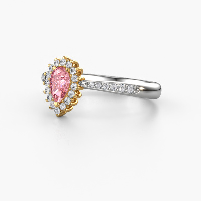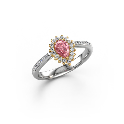 The ring shown above is called the Tilly per 2. We call this type of ring a cluster ring. The centre gemstone is surrounded by smaller sized stones. This 14 Carat white gold version is set with a 6x4 mm pear pink lab grown diamond centre stone, embraced by smaller diamonds. What makes this exclusive white gold cluster ring special is the setting of the smaller gems surrounding the centre pink lab grown diamond, which are shaped like a beautiful flower. The surrounding cluster of stones frame the middle centre stone in such a way to make it appear bigger. This type of engagement ring is also called a flower ring. It is very important that the smaller diamonds are positioned identically so there is no interference of light but perfect unity instead. Our skilled Goldsmiths get the job done. Each individual stone is carefully set by hand. During manufacturing, light fall is constantly monitored to make sure the special cluster effect is still visible. In the end you get the perfect engagement ring with a radiant pink lab grown diamond gemstone centrepiece. You can imagine the effect of a ring of such significance when you give tot the love of your life on her special day to shine. This jewel is made just for you, with attention to detail and design.After receiving your order, our goldsmiths will passionately start the creative process of making your engagement ring in our own studio. Because we don't have a big stockpile, these costs will not be passed on to you. Our pricing is proof of that! We offer top quality jewels at lowest price, guaranteed.Different styles of new rings are made daily by our team. Perhaps you have found a cluster engagement ring somewhere. One you would like to give to your loved one. Please feel free to share your thoughts and design with our jewel designers. We would love to turn your design into a exclusive engagement ring. You can follow the development of your ring design because we use very detailed 3D drawings. On top of that, you can order a dummy of the design. A dummy is a plastic ring, which can be shaped according your ring design. You can try it on and check if the engagement ring is up to standard. We will gladly send you a non-binding offer, based on a fair price/ quality ratio. The offer will baffle you, considering the quality of the ring and gemstones.To make it easier for you, we offer a 30 day return policy. Check our terms and conditions.