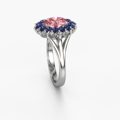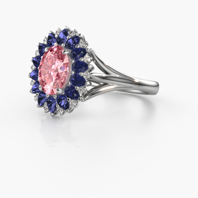 The ring shown above is called the Lidia. We call this type of ring a cluster ring. The centre gemstone is surrounded by smaller sized stones. This 14 Carat white gold version is set with a 8x6 mm oval pink lab grown diamond centre stone, embraced by smaller sapphire. What makes this vintage white gold cluster ring special is the setting of the smaller gems surrounding the centre pink lab grown diamond, which are shaped like a beautiful flower. The surrounding cluster of stones frame the middle centre stone in such a way to make it appear bigger. This type of engagement ring is also called a flower ring. It is very important that the smaller sapphire are positioned identically so there is no interference of light but perfect unity instead. Our skilled Goldsmiths get the job done. Each individual stone is carefully set by hand. During manufacturing, light fall is constantly monitored to make sure the special cluster effect is still visible. In the end you get the perfect engagement ring with a radiant pink lab grown diamond gemstone centrepiece. You can imagine the effect of a ring of such significance when you give tot the love of your life on her special day to shine. This jewel is made with passion and love by one of our master goldsmiths.By using a combination of the latest modern techniques, combined with ancient crafting, we can make all our engagement rings in our own studio. Each jewel is made to order. This is advantageous because we can offer you a price you won't find anywhere else.Have you found a specific engagement ring somewhere which you would like to give to your loved one? Please feel free to express your wishes to our jewel designers because we would be honoured to turn your design into a vintage engagement ring. You can follow the development of your ring design because we use 3D drawings. This gives you a realistic preview of how your design will look. You can also preorder a dummy. A dummy is a plastic ring, which can be shaped according your ring design. You can try it on and check if its width and size are suitable for you. We will gladly send you a non-binding offer, based on a fair price/ quality ratio. It will amaze you, considering the quality of the ring and gemstones.To make it easier for you, we offer a 30 day return policy. Check our terms and conditions.