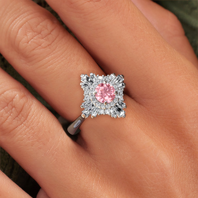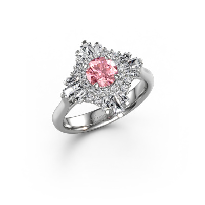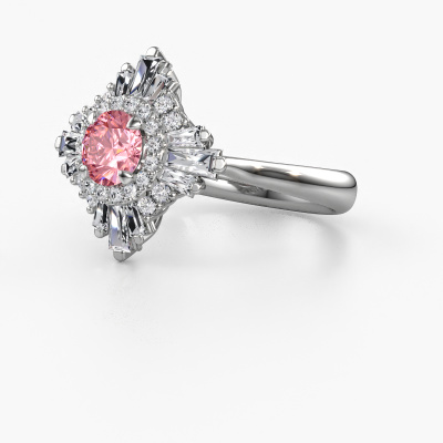 This 14 Carat white gold ring is called Thalia and is set with 5.4 mm pink lab grown diamond. An extraordinary white gold vintage ring. One that will surely make the love of your life shine like a diamond! That is what we hope to achieve. This vintage engagement ring is set with exquisite pink lab grown diamond. Whichever gemstone you choose from our selection, is up to you. The gemstone is selected with great care because we believe your special engagement ring must be adorned with nothing but the most beautiful gemstone. Wouldn't you agree? Our expert goldsmith will design your ring in our own crafting studio, where the pink lab grown diamond will be set with great precision. The ring will then be polished till it shines perfectly. Nothing but the best for the love of your life! This jewel is made with passion and love by one of our master goldsmiths.After receiving your order, our goldsmiths will passionately start the creative process of making your engagement ring in our own studio. Because we don't have a big stockpile, these costs will not be passed on to you. Our pricing is proof of that! We offer top quality jewels at lowest price, guaranteed.Have you found a specific engagement ring somewhere which you would like to give to your loved one? Please feel free to express your wishes to our jewel designers because we would be honoured to turn your design into a vintage engagement ring. You can follow the development of your ring design because we use 3D drawings. This gives you a realistic preview of how your design will look. You can also preorder a dummy. A dummy is a plastic ring, which can be shaped according your ring design. You can try it on and check if its width and size are suitable for you. We will gladly send you a non-binding offer, based on a fair price/ quality ratio. It will amaze you, considering the quality of the ring and gemstones.To make it easier for you, we offer a 30 day return policy. Check our terms and conditions.