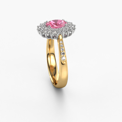 The ring shown above is called the Alina 2. We call this type of ring a cluster ring. The centre gemstone is surrounded by smaller sized stones. This 14 Carat gold version is set with a 7x5 mm oval pink sapphire centre stone, embraced by smaller diamonds. What makes this exclusive gold cluster ring special is the setting of the smaller gems surrounding the centre pink sapphire, which are shaped like a beautiful flower. The surrounding cluster of stones frame the middle centre stone in such a way to make it appear bigger. This type of engagement ring is also called a flower ring. It is very important that the smaller diamonds are positioned identically so there is no interference of light but perfect unity instead. Our skilled Goldsmiths get the job done. Each individual stone is carefully set by hand. During manufacturing, light fall is constantly monitored to make sure the special cluster effect is still visible. In the end you get the perfect engagement ring with a radiant pink sapphire gemstone centrepiece. You can imagine the effect of a ring of such significance when you give tot the love of your life on her special day to shine. This jewel is made just for you, with attention to detail and design.By using a combination of the latest modern techniques, combined with ancient crafting, we can make all our engagement rings in our own studio. Each jewel is made to order. This is advantageous because we can offer you a price you won't find anywhere else.Have you found a specific engagement ring somewhere which you would like to give to your loved one? Please feel free to express your wishes to our jewel designers because we would be honoured to turn your design into a exclusive engagement ring. You can follow the development of your ring design because we use 3D drawings. This gives you a realistic preview of how your design will look. You can also preorder a dummy. A dummy is a plastic ring, which can be shaped according your ring design. You can try it on and check if its width and size are suitable for you. We will gladly send you a non-binding offer, based on a fair price/ quality ratio. It will amaze you, considering the quality of the ring and gemstones.To make it easier for you, we offer a 30 day return policy. Check our terms and conditions.