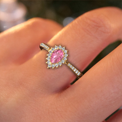 The ring shown above is called the Tilly per 2. We call this type of ring a cluster ring. The centre gemstone is surrounded by smaller sized stones. This 14 Carat gold version is set with a 6x4 mm pear pink sapphire centre stone, embraced by smaller diamonds. What makes this exclusive gold cluster ring special is the setting of the smaller gems surrounding the centre pink sapphire, which are shaped like a beautiful flower. The surrounding cluster of stones frame the middle centre stone in such a way to make it appear bigger. This type of engagement ring is also called a flower ring. It is very important that the smaller diamonds are positioned identically so there is no interference of light but perfect unity instead. Our skilled Goldsmiths get the job done. Each individual stone is carefully set by hand. During manufacturing, light fall is constantly monitored to make sure the special cluster effect is still visible. In the end you get the perfect engagement ring with a radiant pink sapphire gemstone centrepiece. You can imagine the effect of a ring of such significance when you give tot the love of your life on her special day to shine. This jewel is made just for you, with attention to detail and design.After receiving your order, our goldsmiths will passionately start the creative process of making your engagement ring in our own studio. Because we don't have a big stockpile, these costs will not be passed on to you. Our pricing is proof of that! We offer top quality jewels at lowest price, guaranteed.Different styles of new rings are made daily by our team. Perhaps you have found a cluster engagement ring somewhere. One you would like to give to your loved one. Please feel free to share your thoughts and design with our jewel designers. We would love to turn your design into a exclusive engagement ring. You can follow the development of your ring design because we use very detailed 3D drawings. On top of that, you can order a dummy of the design. A dummy is a plastic ring, which can be shaped according your ring design. You can try it on and check if the engagement ring is up to standard. We will gladly send you a non-binding offer, based on a fair price/ quality ratio. The offer will baffle you, considering the quality of the ring and gemstones.To make it easier for you, we offer a 30 day return policy. Check our terms and conditions.